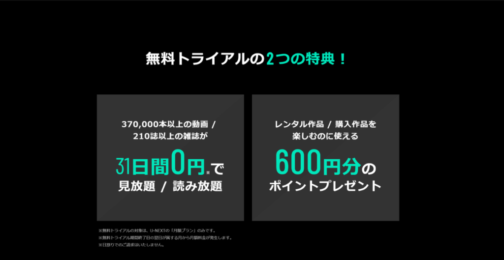 なぜなら、初回31日間の無料トライアルに加えて、600円分のポイントがもらえるため、見放題作品を楽しみながら新作レンタルや電子書籍にも使えるからです。